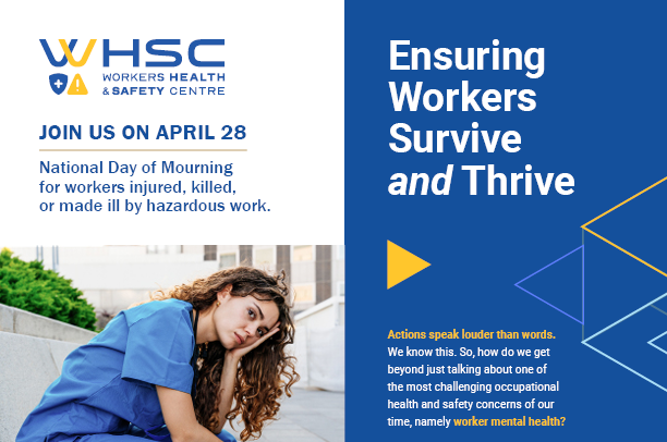 This April 28, on our National Day of Mourning, our labour council will join the Workers Health & Safety Centre (WHSC), the Canadian Labour Congress, the International Labour Organization (ILO), and other worker health and safety advocates throughout Canada, Ontario, and the world, in the call for effective workplace solutions to help ensure workers not only survive but thrive. Worker experiences and research evidence will guide our way.